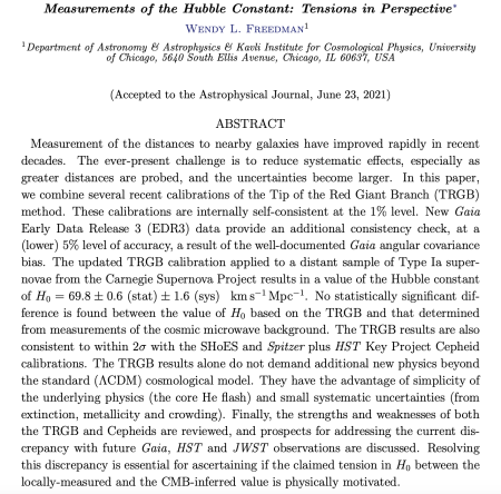 Back in April I posted about a meeting at the Royal Society in London called Challenging the Standard Cosmological Model, some of which I attended virtually. In that post I mentioned that Wendy Freedman gave a talk related to the ongoing issue of the Hubble Tension, i.e. the discrepancy between different types of measurement of the Hubble Constant, usually characterized as local measurements (using stellar distance indicators) and larger-scale measurements (chiefly Planck). There are quite a few posts about this issue on this blog. Anyway, Wendy Freedman mention in her talk that her latest work on stellar distances suggested a value of 69.1 ± km s-1 Mpc-1, which reduces the tension with Planck significantly. At the time, however, there was no paper explaining how this number was derived.