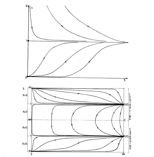 The evolution of Ω is neatly illustrated by the following phase-plane diagram (taken from an old paper by Madsen & Ellis) describing a cosmological model involving a perflect fluid with an equation of state p=(γ-1)ρc2. This is what happens for γ>2/3 (which includes dust, relativistic particles, etc):