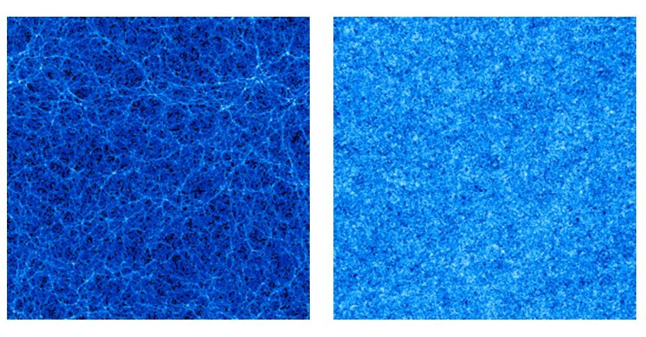 The one on the left is a proper simulation of the “cosmic web” which is at least qualitatively realistic, in that in contains filaments, clusters and voids pretty much like what is observed in galaxy surveys.