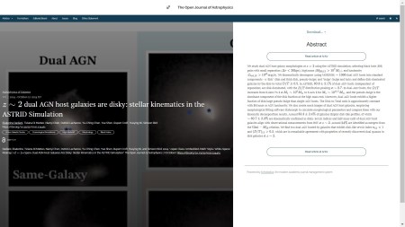 First one up, published on Monday 7th October 2024 is “z~2 dual AGN host galaxies are disky: stellar kinematics in the ASTRID Simulation” by Ekaterina Dadiani (CMU; Carnegie Mellon U.) Tiziana di Matteo (CMU), Nianyi Chen (CMU), Patrick Lachance (CMU), Yue Shen (U. Illinois at Urbana-Champaign), Yu-Ching Chen (Johns Hopkins U.), Rupert Croft (CMU), Yueying Ni (CfA Harvard) and Simeon Bird (U. California Riverside) – all based in the USA. The paper, which is in the folder marked Astrophysics of Galaxies describes a numerical study of the morphology of AGN host galaxies containing close pairs of black holes.