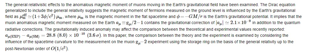 Only time for a short post today, but I think this may turn out to be an important result. There’s a paper by Morishima et al. on the arXiv with the rather dry title Post-Newtonian effects of Dirac particle in curved spacetime – III : the muon g-2 in the Earth’s gravity, which suggests that the anomalous magnetic dipole moment of the muon.