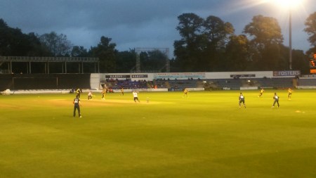 The target of 124 never looked like being enough, although there was nervousness around the ground when Aneurin Donald holed out to mid off early on after which Glamorgan’s batsmen took some time to get the scoreboard moving. But that was just Rudolph and Ingram being sensible. They had no need to rush with such a modest score to chase. Suddenly Ingram sprang into life and took the bull by the horns. The scoring accelerated with a flurry of boundaries, the tension melted away and the Glamorgan supporters starting singing. In all, Ingram clubbed five huge sixes including one that went so high I lost it in the floodlights and feared it might land on my head. It actually landed in the crowd a few yards away but didn’t cause any injury. Ingram is an impressive player when he gets doing – he hits the ball very hard but it looks so effortless, and he’s as skilled with the rapier as with the bludgeon: many deft flicks and cuts were included in his innings.