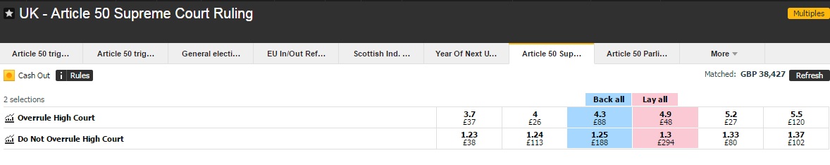Posted in mathematics with tags Article 50, Betfair, Betting Exchange, Lay Betting, Odds, Parliament, True Odds, William Hill on December 6, 2016 by telescoperThis week the UK Supreme Court is hearing an appeal by HM Government against the judgment recently delivered by the High Court which was that the UK Government must seek the approval of Parliament before it can invoke Article 50 of the Lisbon Treaty and thus begin the process of leaving the European Union. You can watch the proceedings live here. I had a brief look myself this morning but as I’m not a legal expert I found it rather hard to follow as it’s rather technical stuff. That wasn’t helped by the rather dull delivery of James Eade QC who was presenting the government’s case. Nevertheless, it is a very good thing that we can see how the law work in practice. I was surprised at the lack of gowns and wigs!