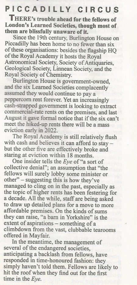 Posted in The Universe and Stuff with tags Burlington House, Private Eye, Royal Astronomical Society on October 27, 2020 by telescoperHaving been forewarned of this story as soon as my copy of Private Eye arrived (this morning, owing to the Bank Holiday weekend) I headed straight to this: