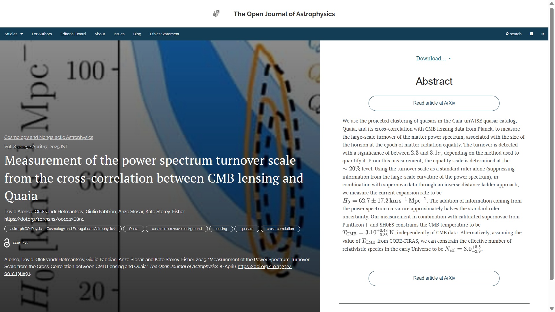 The last paper of the five published this week is “Measurement of the power spectrum turnover scale from the cross-correlation between CMB lensing and Quaia” by David Alonso (Oxford, UK), Oleksandr Hetmantsev (Kyiv, Ukraine), Giulio Fabbian (Cambridge, UK), Anze Slosar (Brookhaven National Laboratory, USA) and Kate Storey-Fisher (Stanford, USA). This is a discussion of using the spatial correlations of quasars and their cross-correlations with cosmic microwave background lensing data to measure a feature corresponding to the matter-radiation equality scale with consequences for cosmological parameter estimation. It was published on Thursday 17th April 2025 in the folder Cosmology and NonGalactic Astrophysics.