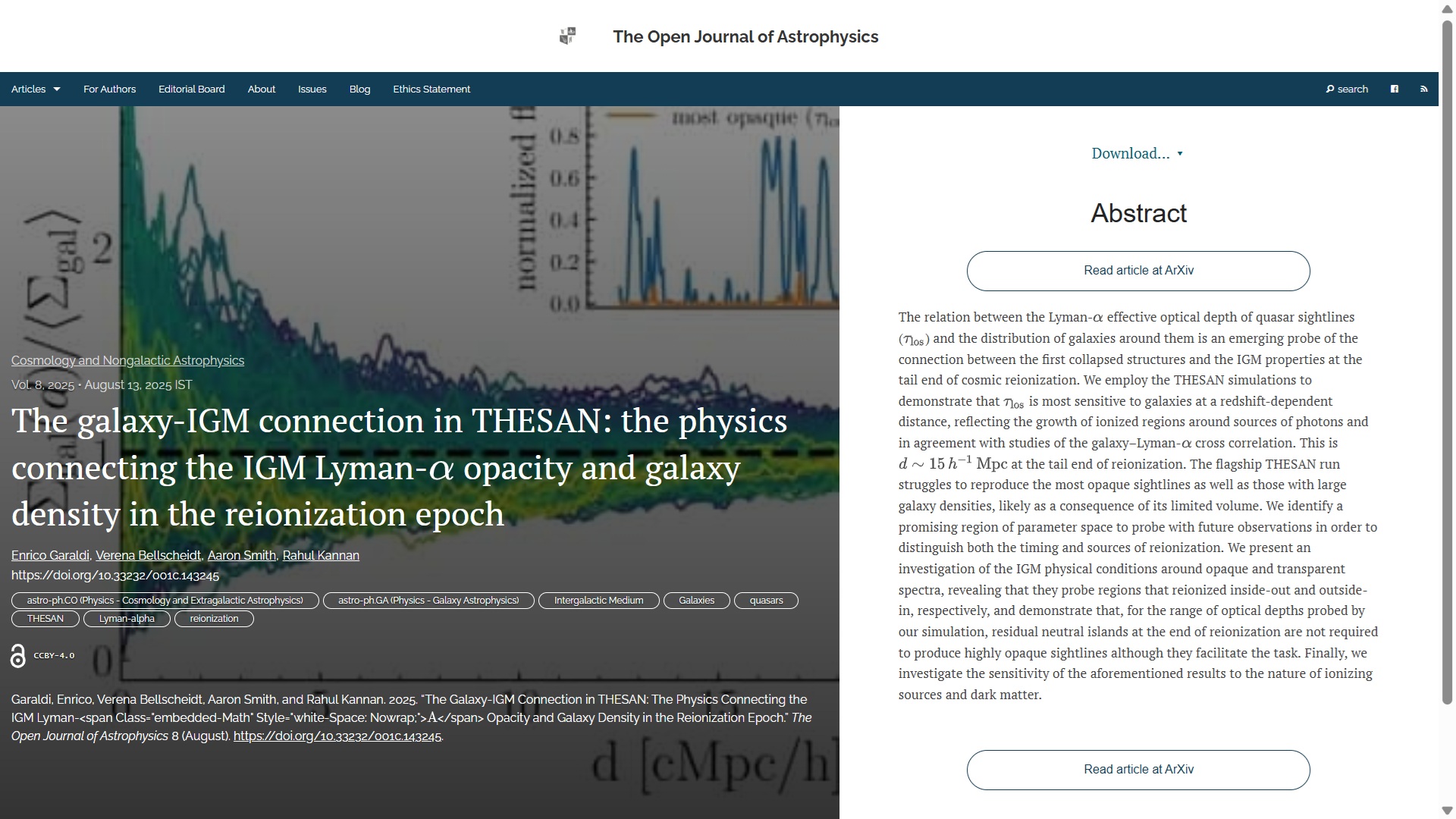 The other paper this week, published in the folder Cosmology and Nongalactic Astrophysics, is “The galaxy-IGM connection in THESAN: the physics connecting the IGM Lyman-alpha opacity and galaxy density in the reionization epoch” by Enrico Garaldi (University of Tokyo, Japan), Verena Bellscheidt (Technical University of Munich, Germany), Aaron Smith (York University, Canada) and Rahul Kannan (University of Texas at Dallas, USA).  It presents a study of the relation between the Lyman-alpha effective optical depth of quasar sightlines and the distribution of galaxiesas as a probe of ionized regions around sources of photons. It was published on Wednesday August 13th 2025.