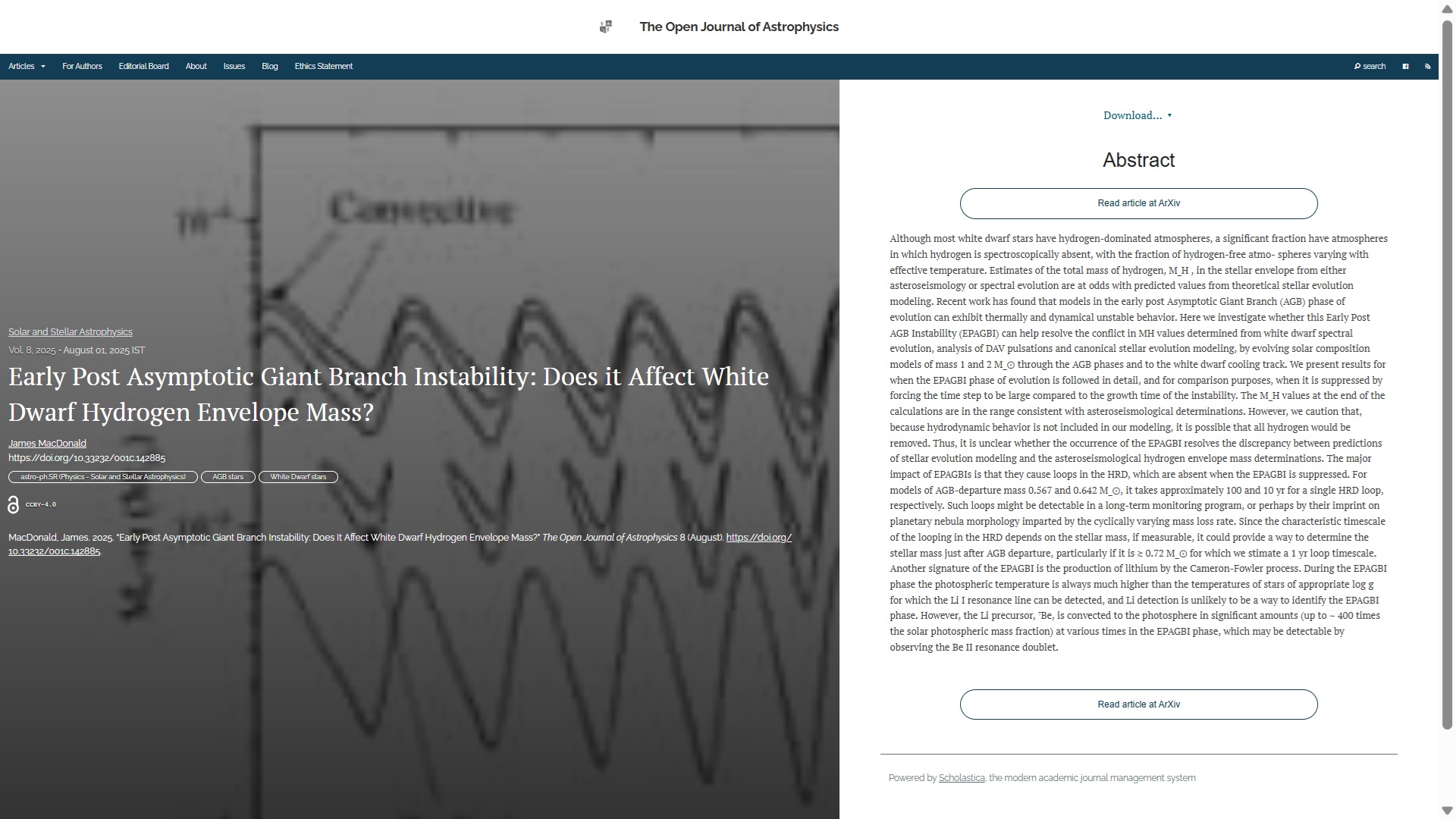 The third paper of the week is “Early Post Asymptotic Giant Branch Instability: Does it Affect White Dwarf Hydrogen Envelope Mass?” by James MacDonald (University of Delaware, USA). This one was published on Friday 1st Auguest (i.e. yesterday) in the folder Solar and Stellar Astrophysics. It is an investigation into whether Early Post AGB Instability (EPAGBI) can affect determinations of the total abundance of hydrogen in white dwarf stars.