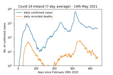 Meanwhile, out of interest, here is my latest summary plot (dated 14th May) which shows new cases steady at the (uncomfortably) high level of around 430 per day (7-day average) but deaths falling:
