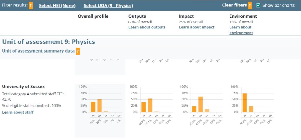 To give some background: the overall REF score for a Unit of Assessment (UoA; usually a Department or School) is obtained by adding three different components: outputs (quality of research papers); impact (referring to the impact beyond academia); and environment (which measures such things as grant income, numbers of PhD students and general infrastructure). Scores are assigned to these categories, e.g. for submitted outputs on a scale of 4* (world-leading), 3* (internationally excellent), 2* (internationally recognized), 1* (nationally recognized) and unclassified. Similar star ratings are applied to the impact and environment. These are weighted at 60%, 25% and 15% respectively in the current incarnation of REF.