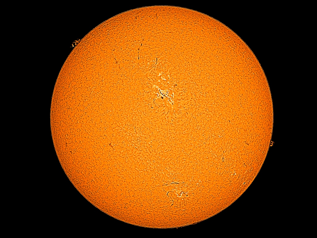 Another more direct analogy is provided by the Sun. Here’s a picture of said object, taken through an H-α filter..