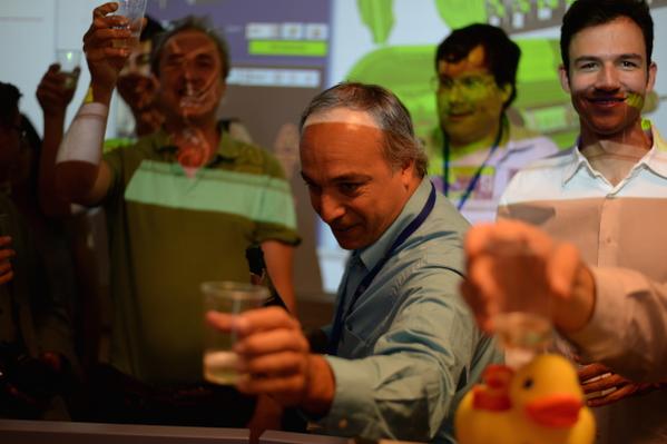 However, it didn’t take long to succeed, at which point much celebration ensued. This story has a strong local connection here in the Department of Physics & Astronomy at the University of Sussex. The run coordinator for the ATLAS experiment on the Large Hadron Collider is Dr Alessandro Cerri of Sussex and he has figured prominently in today’s action. Here he is, having a glass of bubbly (purely medicinal, I’m assured) when they first achieved stable beams at the new collision scale: