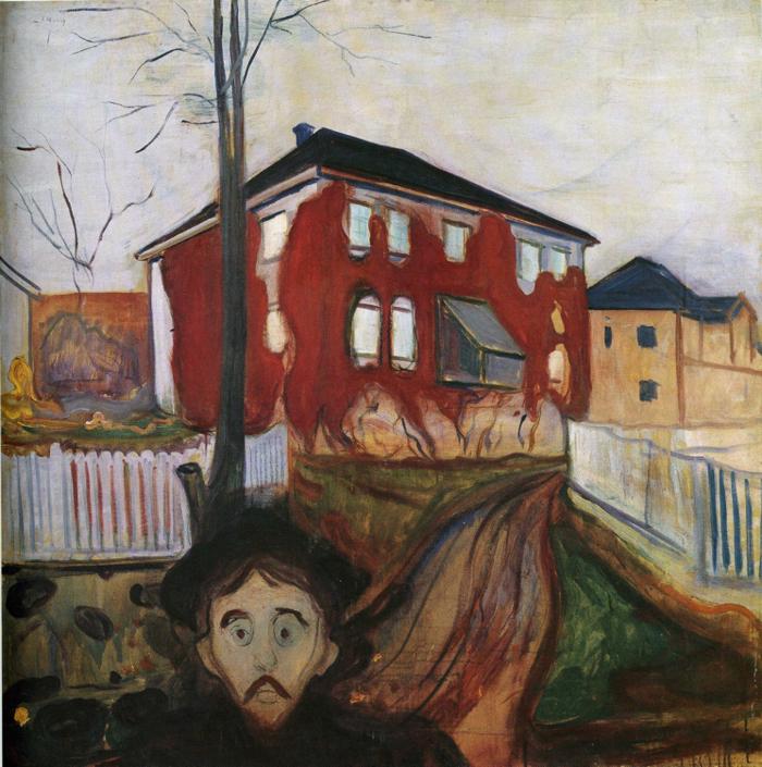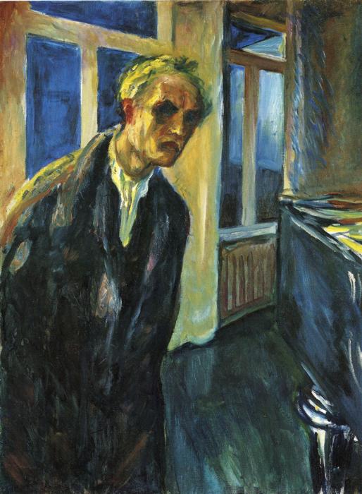 But the most powerful works by Munch were made later in his life. He was born in 1863 (100 years before me) and suffered a complete nervous breakdown in 1908. Here is a self-portrait called The Night Wanderer, showing himself as a gaunt insomniac figure wandering around a darkened house: