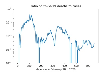 Anyway, to look at this a bit more clearly I plotted the ratio of daily reported deaths to daily confirmed cases over the course of the pandemic. This is the result: