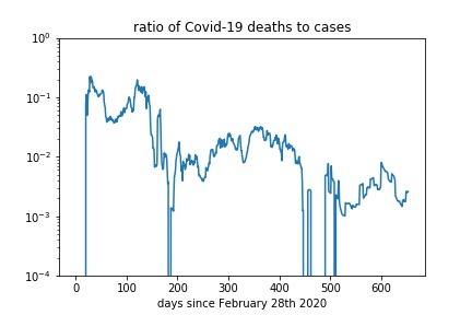The spike is still there, but is much decreased in size, suggesting that a two week lag between cases and deaths is a more useful ratio to look at. Note the ratio of deaths to cases is significantly lower from 500 days onwards than it was between 200 and 400 (say), by a factor a bit less than ten.